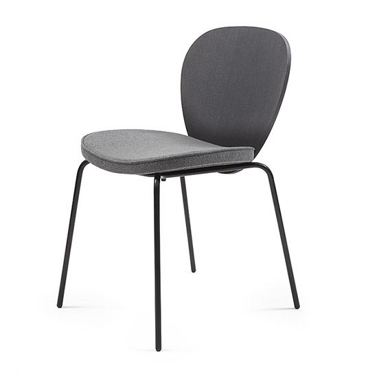 Chair with 4 legs steel frame. Back in curved plywood (ash). Upholstered seat. |