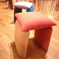 Pillow d’Andrea Anastasio, 3 pièces aux couleurs différentes évoquant les nuances de l’eau, de la terre et du feu.