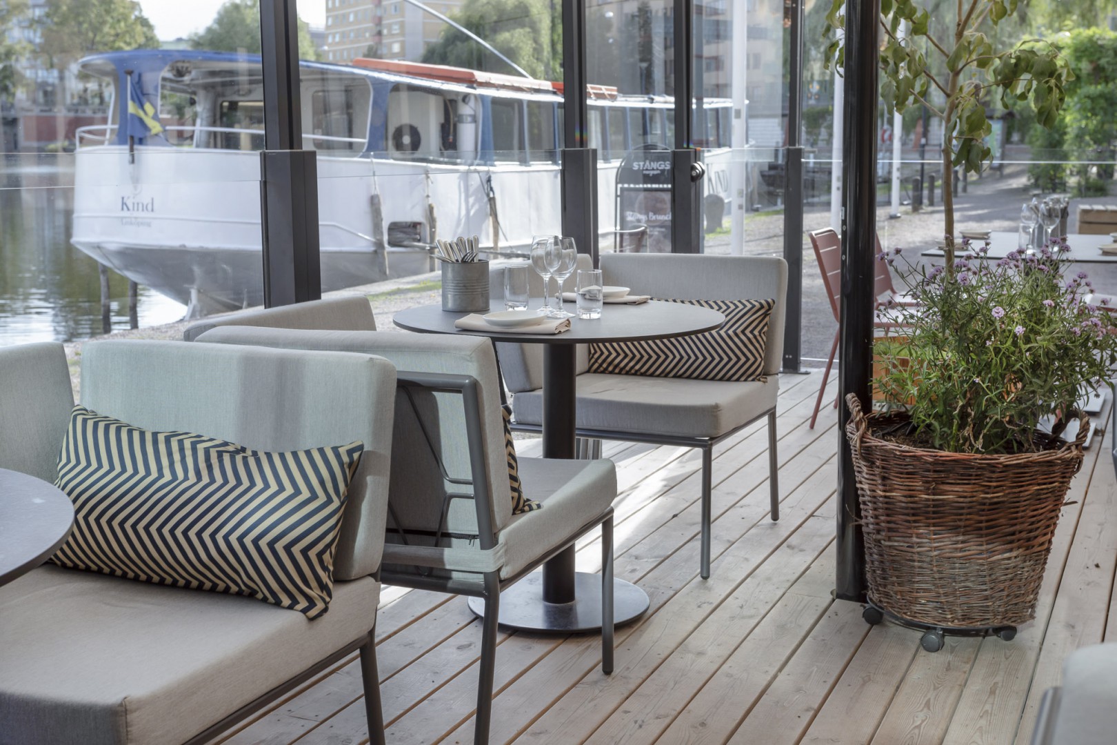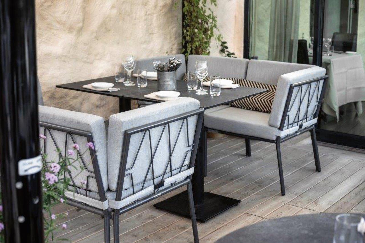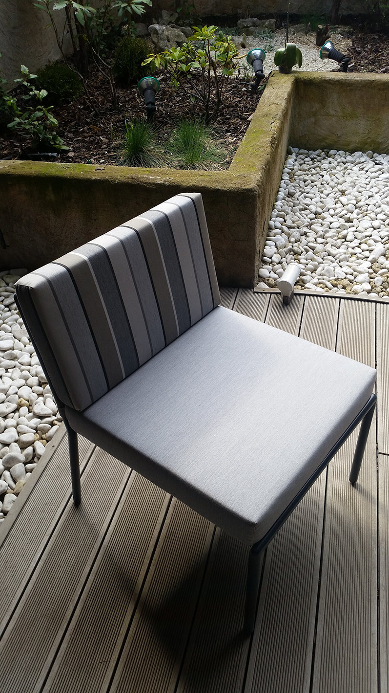 I cuscini, rimovibili, sono rivestiti in tessuto idrorepellente facilmente asportabile, in varie tonalità e colori, per creare i più svariati abbinamenti cromatici con la struttura stessa.