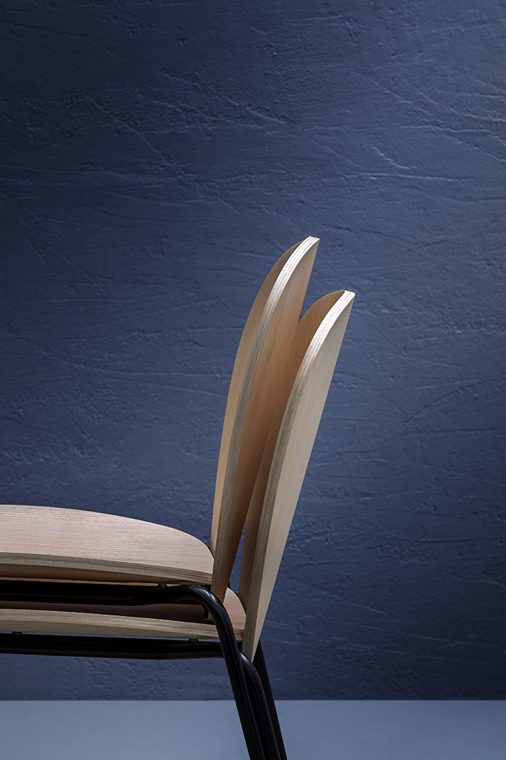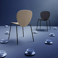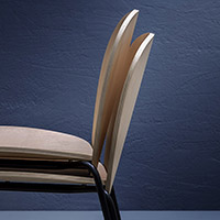 Sedia con telaio 4 gambe in tubo acciaio, seduta e schienale in compensato curvato (frassino).