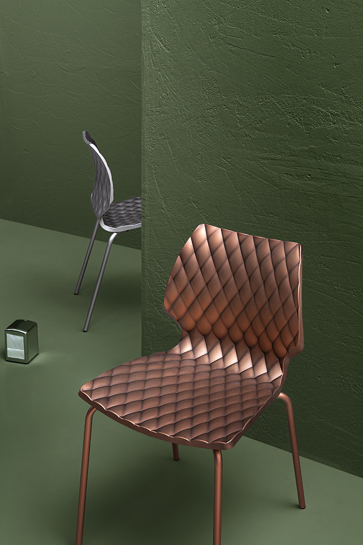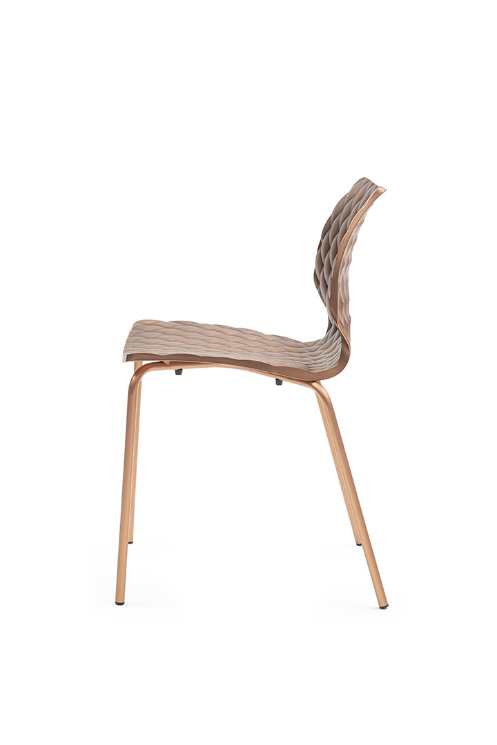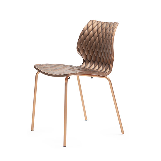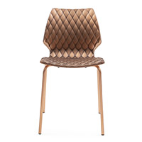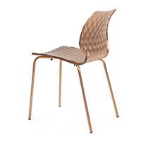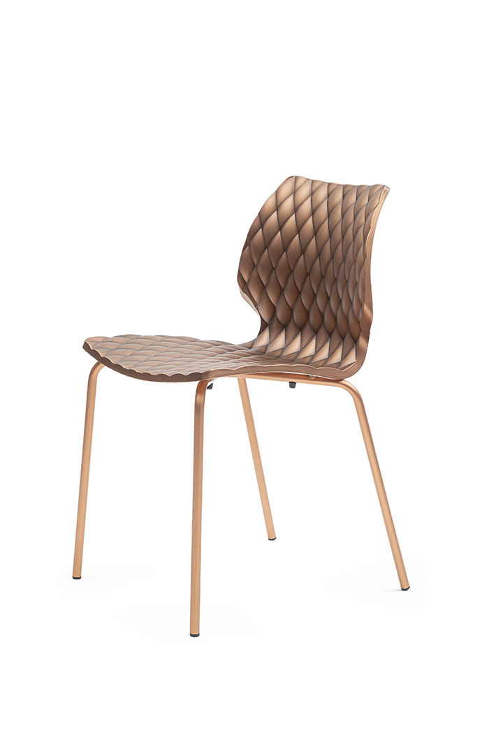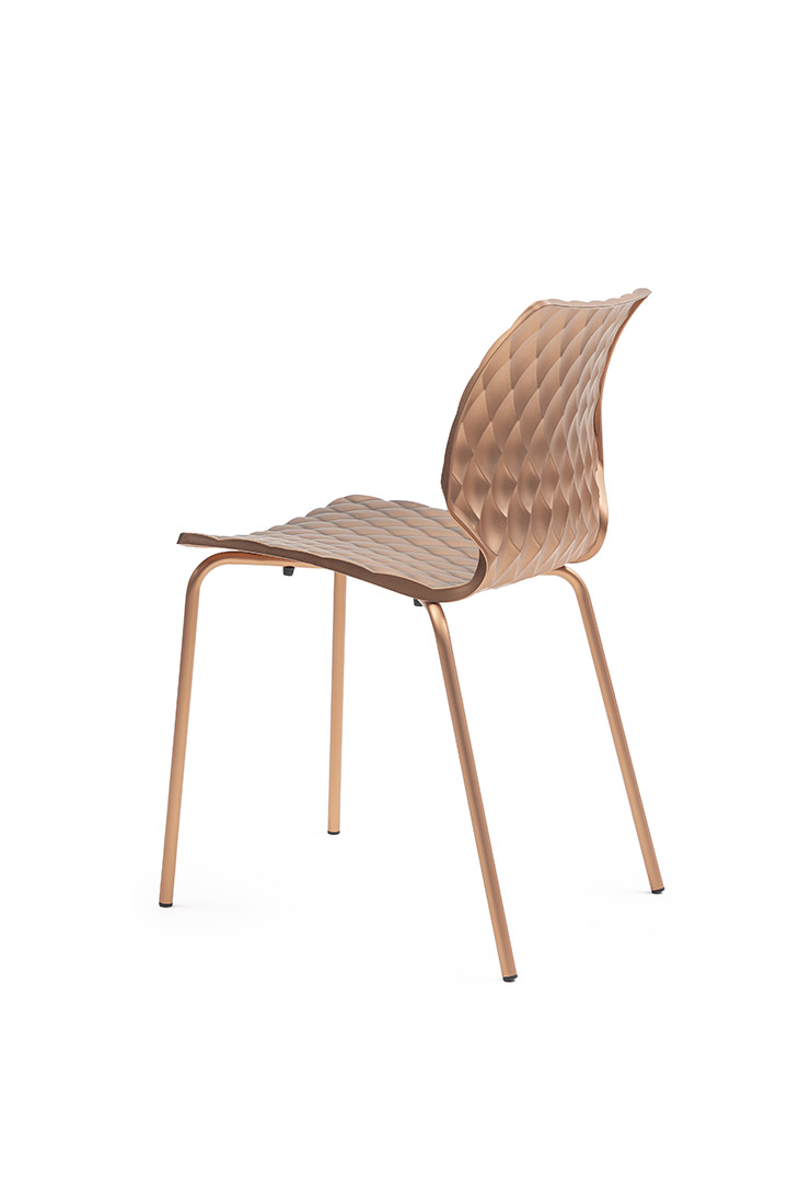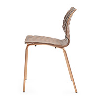 Sedia con telaio a 4 gambe in tubo acciaio. Seduta in polipropilene con finitura metallica satinata.