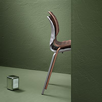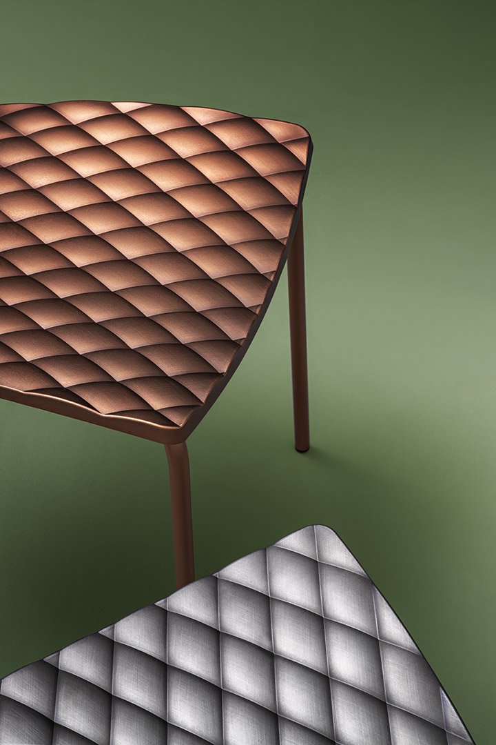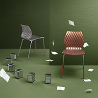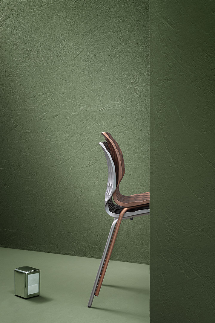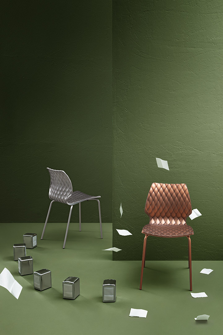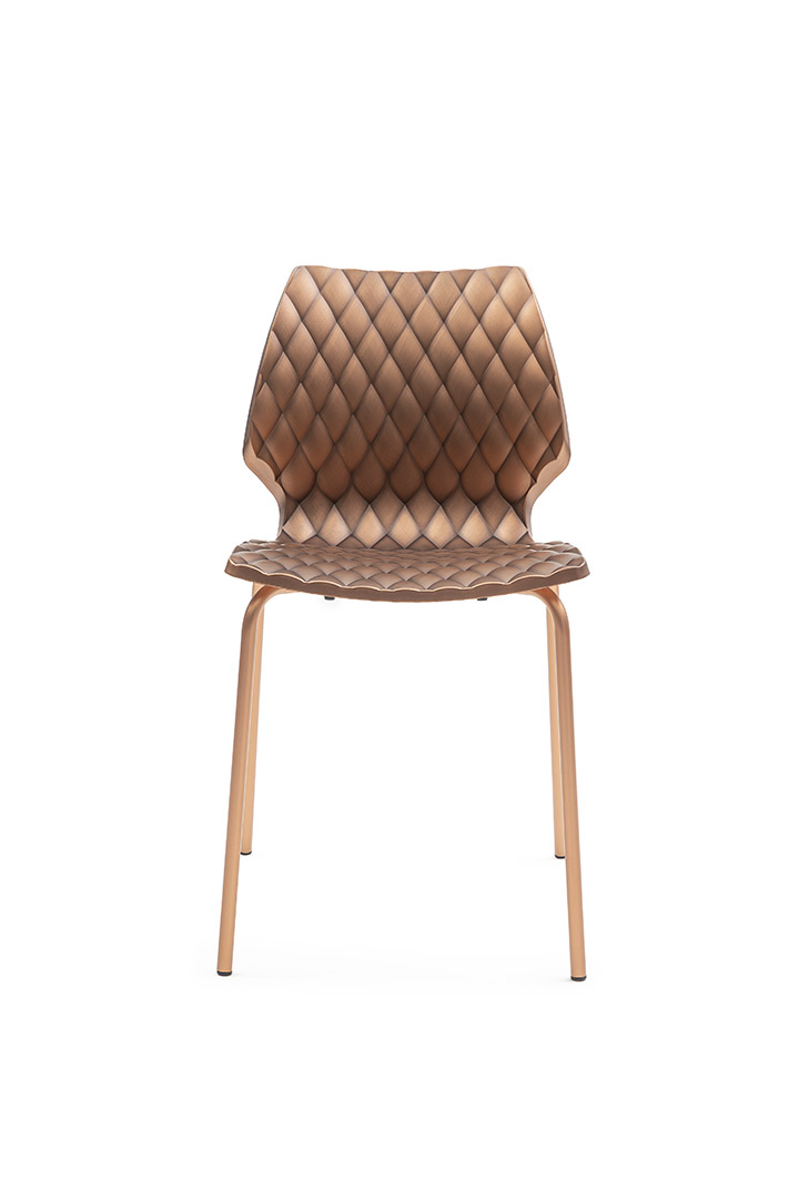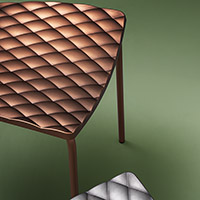 Sedia con telaio a 4 gambe in tubo acciaio. Seduta in polipropilene con finitura metallica satinata.